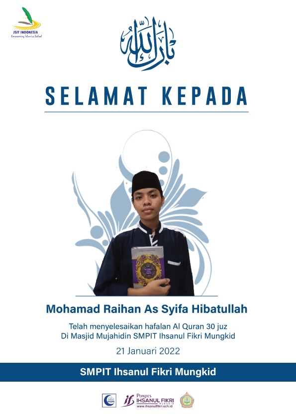 Dua tahun pasca pandemi hari ini Jumat 21 Januari 2022 salah satu santri kelas IX SMPIT Ihsanul Fikri Mungkid Kabupaten Magelang menyelesaikan hafalan Al Quran 30 juz. Raihan Asyifa santri kelas IX tahfidz menyetorkan hafalan Surat Al Hadid, menggenapi total hafalannya menjadi 30 juz.